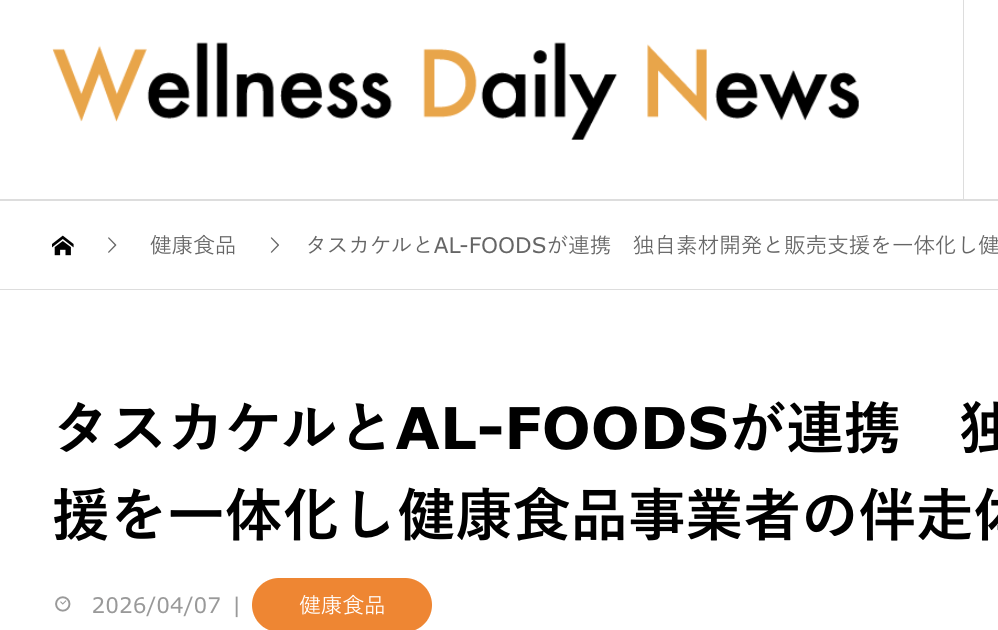 PR TIMES(2026年4月1日)にて『タスカケル株式会社とAL-FOODS株式会社、販売事業者向け連携体制を強化品質評価制度運営 × 販売支援 × 独自素材開発で、“作る”と“売る”をつなぐ伴走モデルを推進。』とし […]